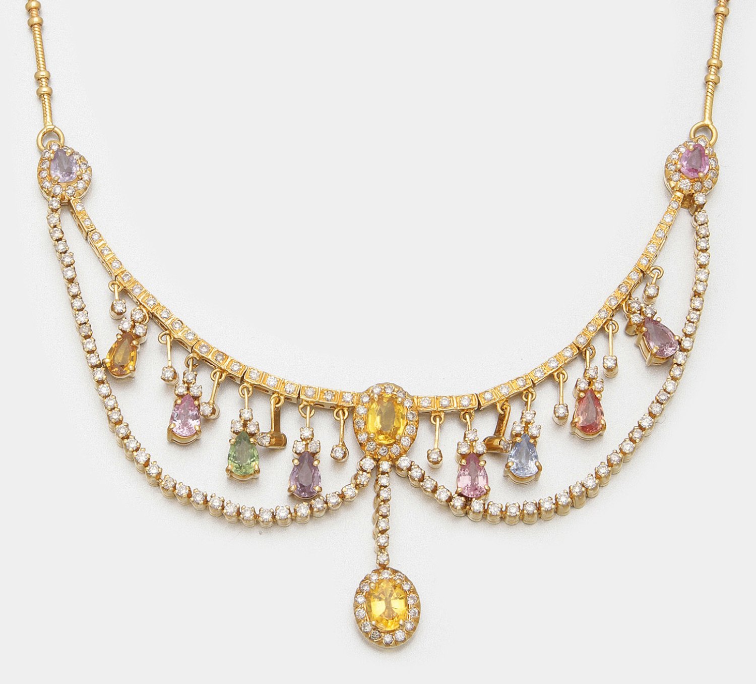 Necklace set with multi color sapphires approx. 6,48 ct. and diamonds approx. 3,11 ct., in 18 k gold.