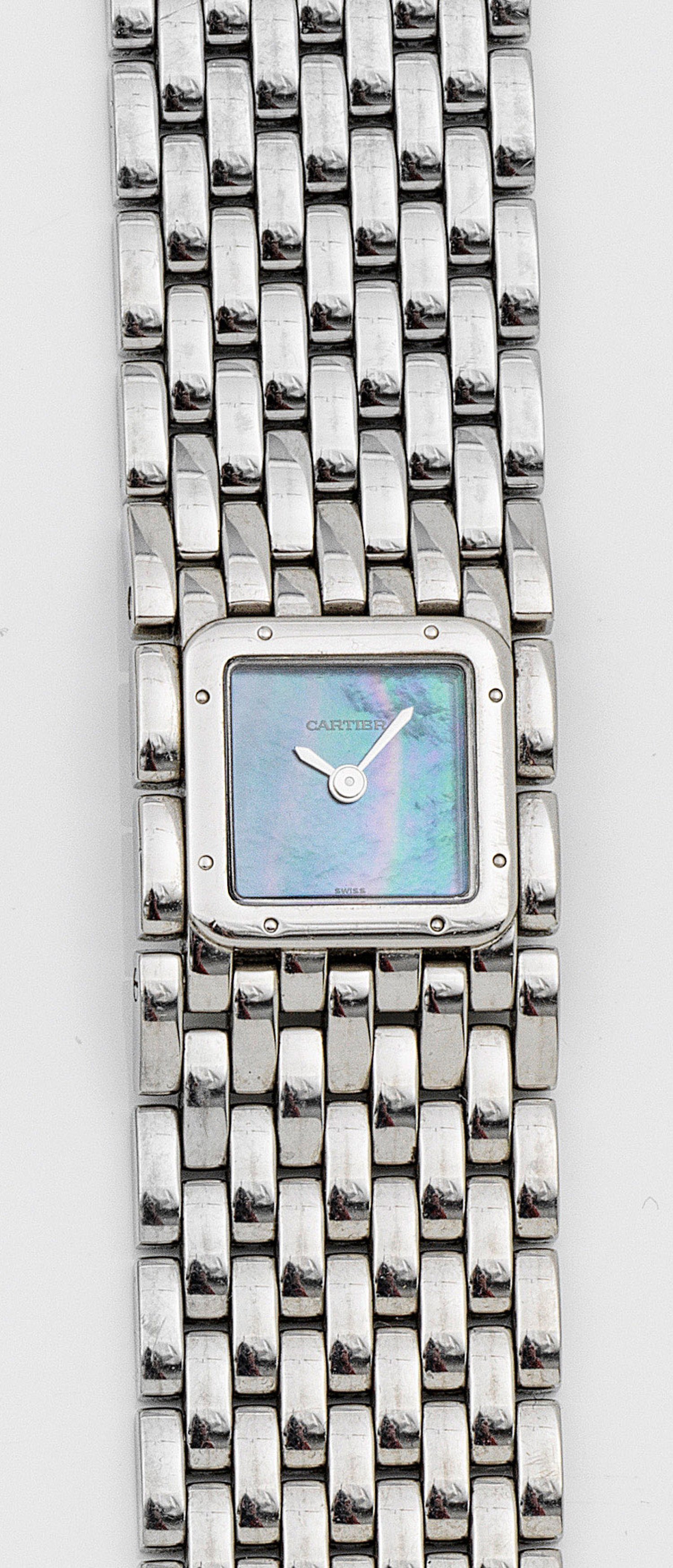 Stahl. Quadratisches Uhrengehäuse mit aufgeschraubter Lünette, blau-violett changierendes Perlmutter-Zifferblatt. Breites Panthère-Gliederarmband mit doppelter Faltschließe. Quarzwerk. Herstellerzeichen. Ref.-Nr. 43652PB. Original Box.