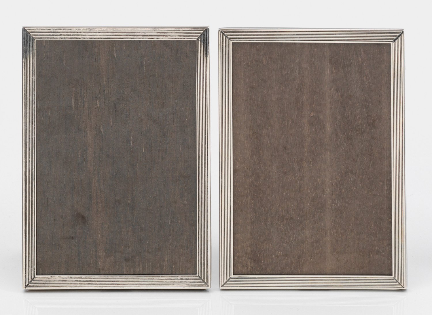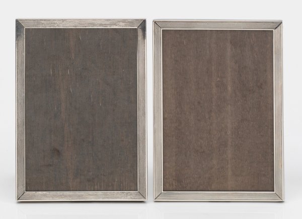 Silber. 2-tlg.; Zwei kleine, hochrechteckige Rahmen. Schmale, schlicht elegante, mehrfach durch Profillinien gegliederte Rahmung. Rückseitig aufstellbar. Gest. 925, Herstellerzeichen "JF". H. 15 cm - 10,5 cm.