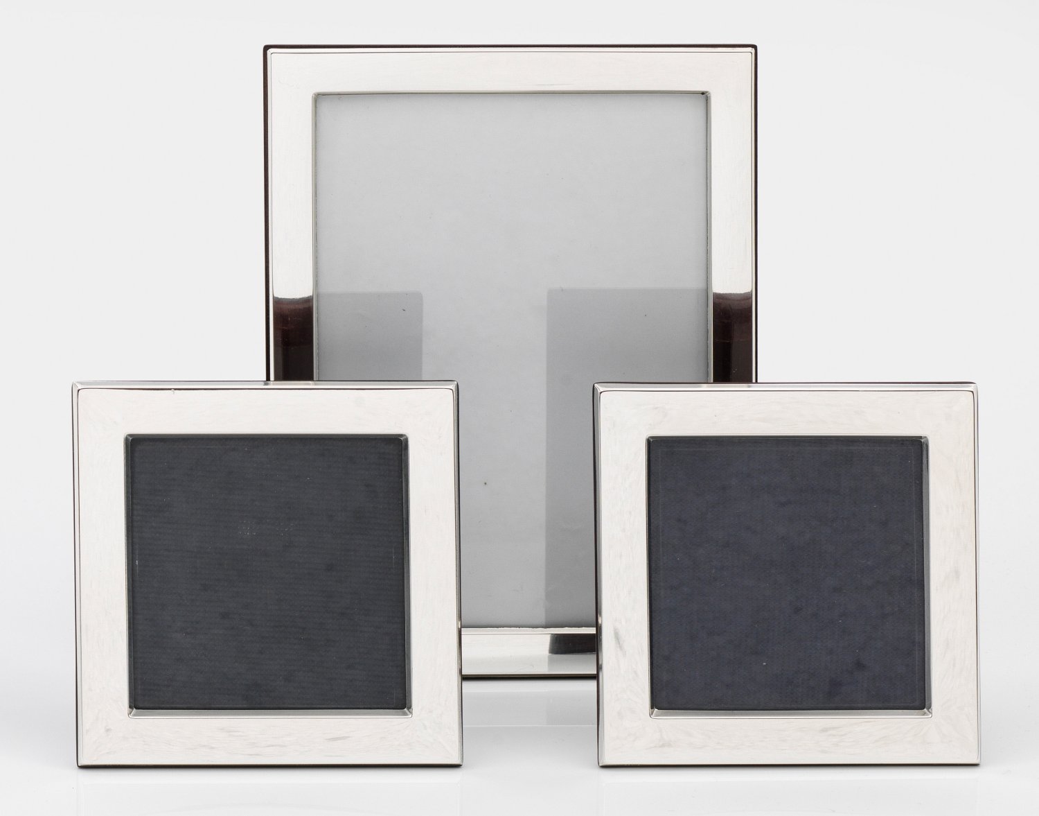 Silber. 3-tlg.; Zwei kleine, quadratische und ein großer, hochrechteckiger Rahmen. Breite, schlicht elegante und glatte Rahmung. Rückseitig aufstellbar. Gest. 925, Beschauzeichen. H. 11,5 cm - 20,5 cm.