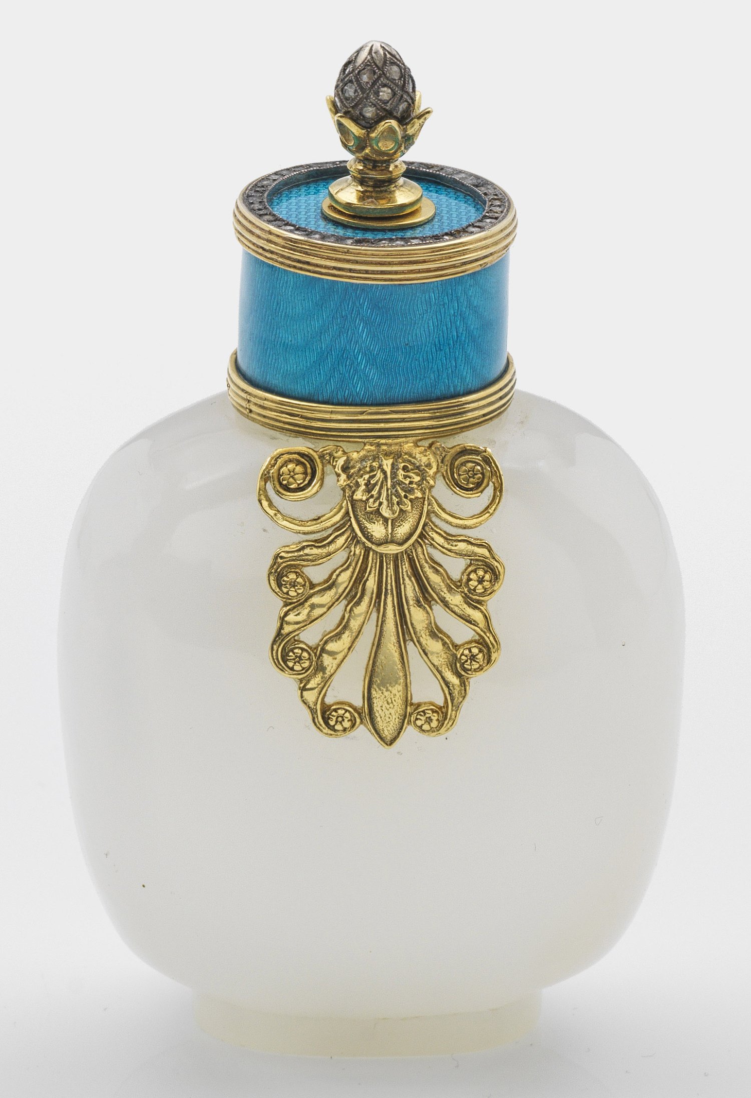 im Stil von Karl Fabergé. Achat mit vergoldeter und teilw. emaillierter Silbermontierung. Massiver Korpus aus weißem, geschliffenem Achat mit applizierten, durchbrochen gearbeiteten und antikisierten Blattornamenten. Darüber zylindrischer Hals, gerahmt von Profilringen und umlaufend hellblau emailliertem Grund. Obenauf ein umlaufender Ring aus Diamantrosen. Herausnehmbarer Löffel mit vollplastisch gearbeiteter, stilisierter Knospe als Knauf. Gest. 88. H. 10 cm.