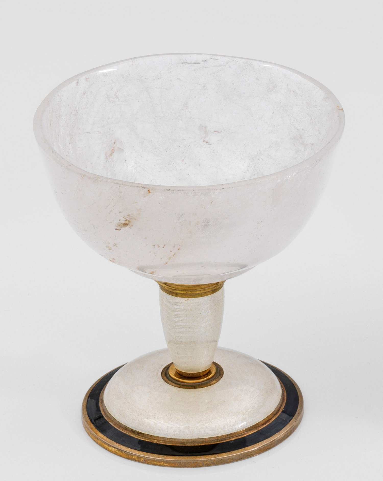 in der Art von Karl Fabergé. Bergkristall und Silber, vergoldet, teilw. emailliert. Trompetenförmig aufgewölbter Stand, umzogen von flächendeckend wellenförmig guillochiertem und weiß emailliertem Fond. Der Rand von schwarzem Email umzogen. Obenauf halbrunde Kuppa aus geschliffenem Bergkristall. Gest. 84. H. 17 cm. D 16 cm.