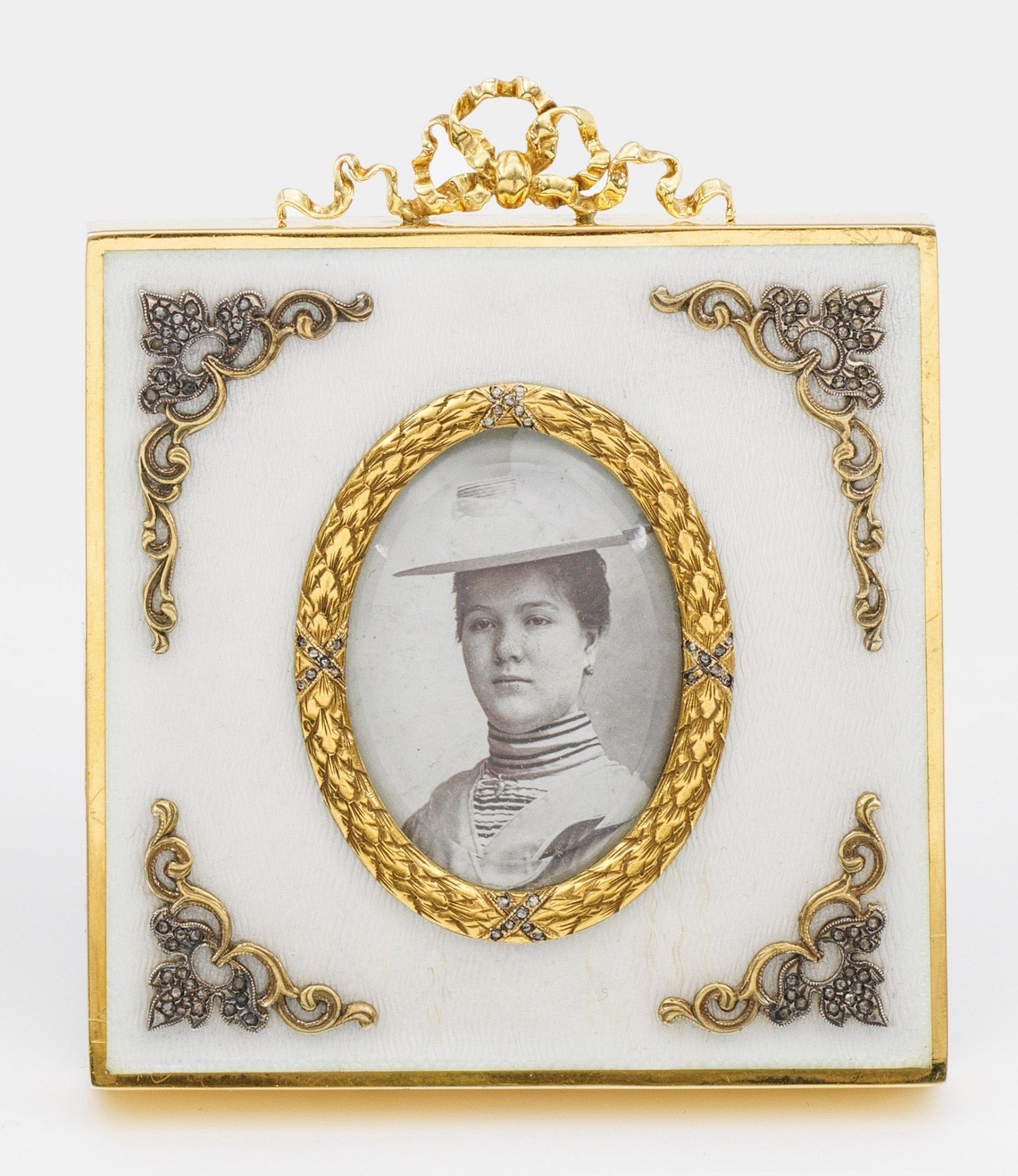 im Stil von Karl Fabergé. Silber, vergoldet und teilw. emailliert. Quadratische Form, bekrönt von freiplastischem Schleifenornament. Guillochierter und weiß emaillierter Grund. Ovaler, mit Lorbeerkranz und Kreuzbanddekor versehener Bildausschnitt. Die Ecken verziert mit applizierten Ornamenten, besetzt mit kleinen Diamantrosen. Rückseitig aufstellbar. Minim. ber.; Gest. 88. 9,5 cm x 8 cm. Bildausschnitt: 4,3 cm x 3,3 cm.