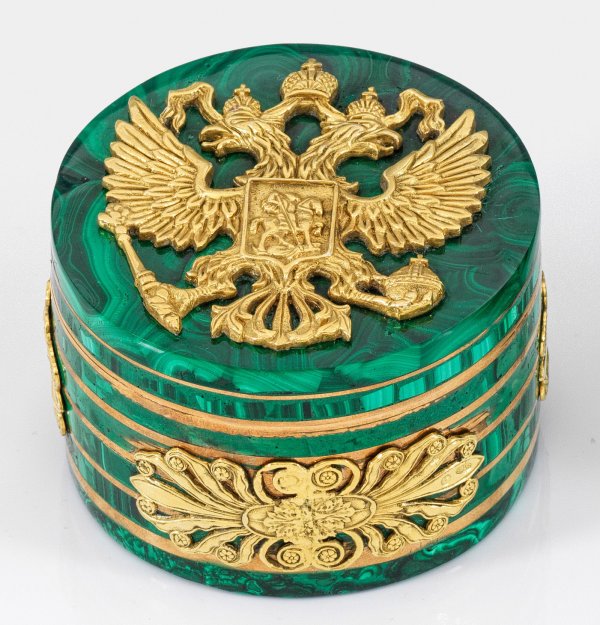 Malachit und Silber, vergoldet. Runder, zylindrischer Korpus, gegliedert durch mehrere eingelassene Zierbänder. Die Wandung verziert mit reliefierten Ornamenten. Auf flachem Deckel reliefplastisch applizierter und gekrönter russischer Doppeladler. Wandungsinnenseite mit grünem Filz ausgekleidet. Gest. 84. H. 6,5 cm. D. 11,5 cm.