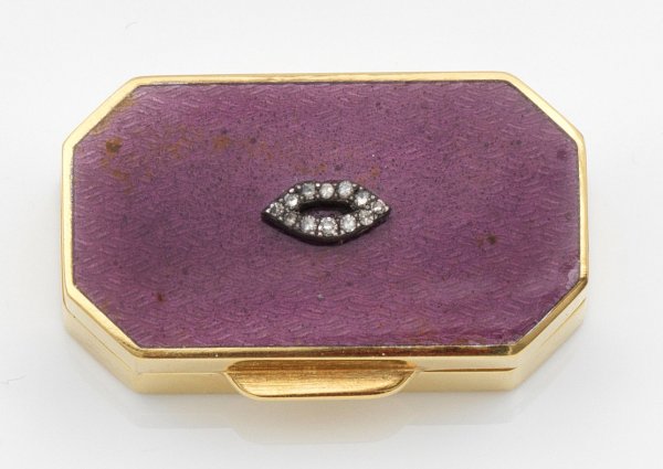 im Stil von Karl Fabergé. Silber, vergoldet und emailliert. Rechteckiger Korpus mit gekanteten Ecken. Scharnierter Deckel, zentral besetzt mit kleinem, appliziertem und stilisiertem Kussmund, ausgefasst mit kleinen Diamantrosen über brombeerfarbenem, emailliertem und guillochiertem Grund. Minim. best.; Gest. 88. Gew. ca. 35 g. H. 1,2 cm. 3,8 cm x 2,2 cm.