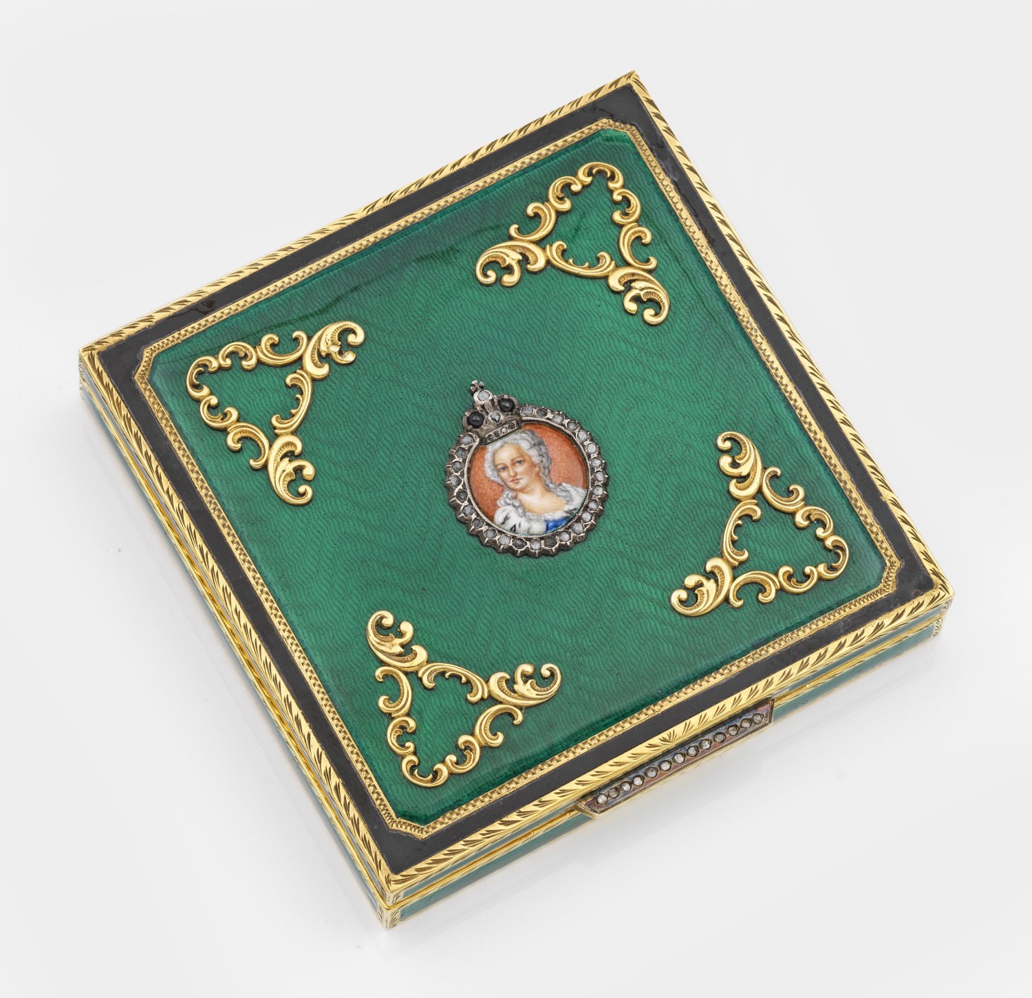 im Stil von Karl Fabergé. Silber, vergoldet und teilw. emailliert. Quadratisch mit gerader Wandung. Auf der Wandung und dem scharnierten Deckel von schwarzem, linearem Email umzogene, grün emaillierte Kartuschen über fein guillochiertem Grund. Im Deckel eingelassene, bekrönte Porträtminiatur von Zarin Katharina II in polychromer Emailmalerei, umzogen von Diamantrosen. Die Ecken mit applizierten, durchbrochen gearbeiteten Ornamenten verziert. Gest. 88. Gew. ca. 400 g. H. 2,3 cm. 10 cm x 10 cm.