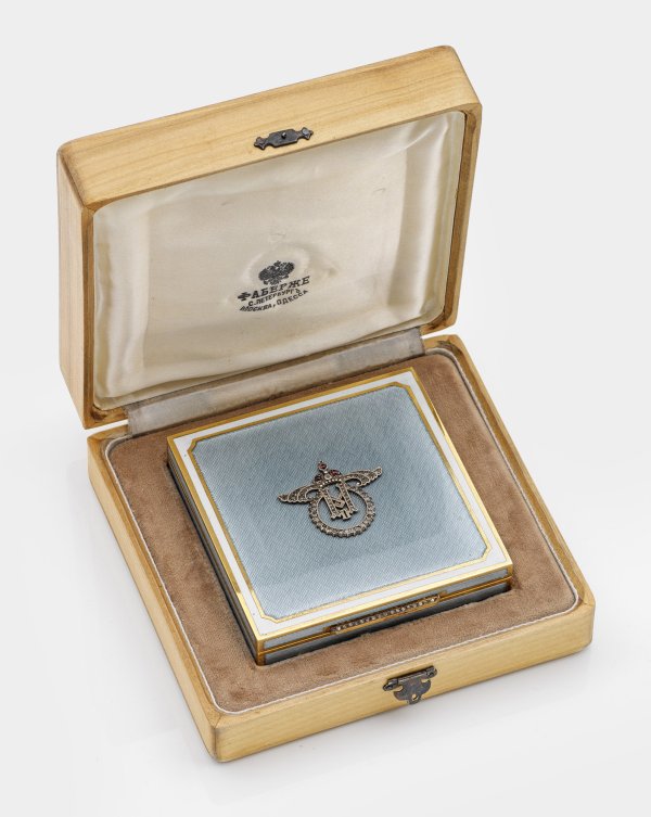 im Stil von Karl Fabergé. Mit Holzbox. Silber, vergoldet, teilw. emailliert. Quadratische Form. Deckel und Wandung von weißer Emaille gerahmt, guillochiert und gelb emailliert. Mittig bekröntes Monogramm aus Silber in Zierschrift, besetzt mit drei Granatcabochons und Diamantrosen. Linearer Drücker ebenfalls mit Diamantrosen besetzt. Gest. 88. Gew. ca. 375 g. 2 cm. 9,8 cm x 9,8 cm.