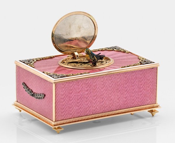 im Stil von Karl Fabergé. Rosafarbenes, wellenförmiges Guilloché-Email, teilw. Gold, 14 ct.; Rechteckige Dose auf vier Füßen, unten Perlrand, oben Profilrand. Die Oberseite mit aufgelegten Voluten und Ranken. Altschliffdiamanten in Pavé-Fassung. Der ovale, champagnerfarben emaillierte Sprungdeckel mit einem plastisch gearbeiteten Monogramm mit Diamanten bekrönt. Innen ein Singvogelautomat mit buntem Vögelchen, das in Betrieb unter dem geöffneten Deckel auf einem Gitter aus rankenförmigen Voluten tanzend und singend hervorgehoben wird. Originaler Aufzugschlüssel. Gangbar. Unterseite minim. best.; Gest. 56 (583er). H. 5 cm. 10,5 cm x 7 cm.