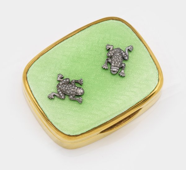 im Stil von Karl Fabergé. Silber, vergoldet, teilw. emailliert. Rechteckige Form mit gerundeten Ecken. Auf gering gewölbtem, scharniertem Deckel über lindgrün emailliertem und wellenförmig guillochiertem Grund zwei applizierte, reliefplastische Frösche mit Diamantrosen besetzt. Gest. 88. Gew. ca. 150 g. 7 cm x 5,5 cm.