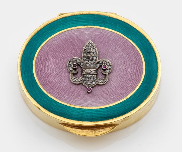 im Stil von Karl Fabergé. Silber, vergoldet und emailliert. Ovaler Korpus. Scharnierter Deckel, zentral besetzt mit applizierter heraldischer Lilie, ausgefasst mit Diamantrosen über altrosafarben emailliertem und guillochiertem Grund. Umlaufend ein dunkeltürkis emaillierter Rahmen mit goldener Profillinie. Gest. 88. Gew. ca. 70 g. H. 1,7 cm. 5,2 cm x 4,5 cm.