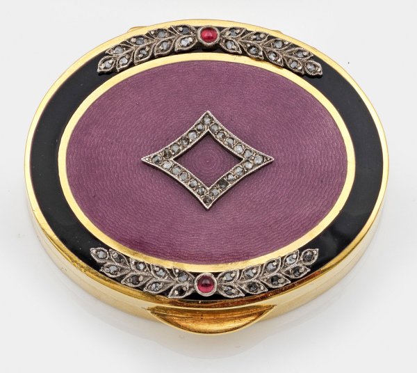 im Stil von Karl Fabergé. Silber, vergoldet und emailliert. Ovaler Korpus. Scharnierter Deckel, besetzt mit applizierter Raute und zwei Lorbeerzweigen, ausgefasst mit Diamantrosen und kleinen Farbsteincabochons über altrosafarben emailliertem und guillochiertem Grund. Umlaufend ein schwarz emaillierter Rahmen mit goldener Profillinie. Gest. 88. Gew. ca. 95 g. H. 1,7 cm. 5,7 cm x 5 cm.