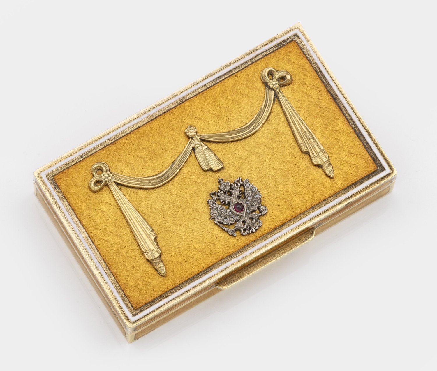 im Stil von Karl Fabergé. Silber, vergoldet, teilw. emailliert. Rechteckige Form. Deckel und Wandung von weißer Emaille gerahmt, guillochiert und gelb emailliert. Der Deckel verziert mit appliziertem, reliefplastischem Feston über Doppeladler, besetzt mit Diamantrosen und Granatcabochon. Gest. 88. Gew. ca. 265 g. H. 2 cm. 10 cm x 6 cm.