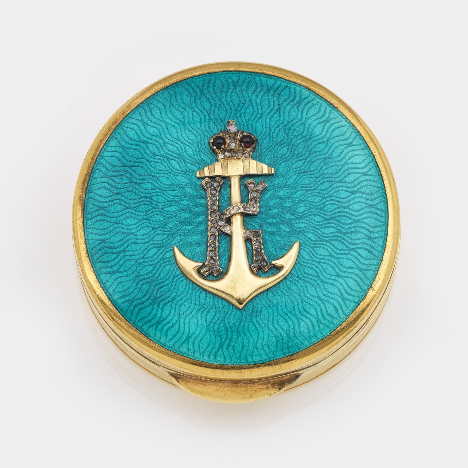 im Stil von Karl Fabergé. Silber, vergoldet, teilw. emailliert. Runde Form. Auf gering gewölbtem, scharniertem Deckel über türkis emailliertem und strahlenförmig guillochiertem Grund ein appliziertes Monogramm mit bekröntem Anker und Diamantrosen besetzt. Die Wandung von wellenförmigem Dekor umzogen. Gest. 88. Gew. ca. 155 g. D. 7 cm.
