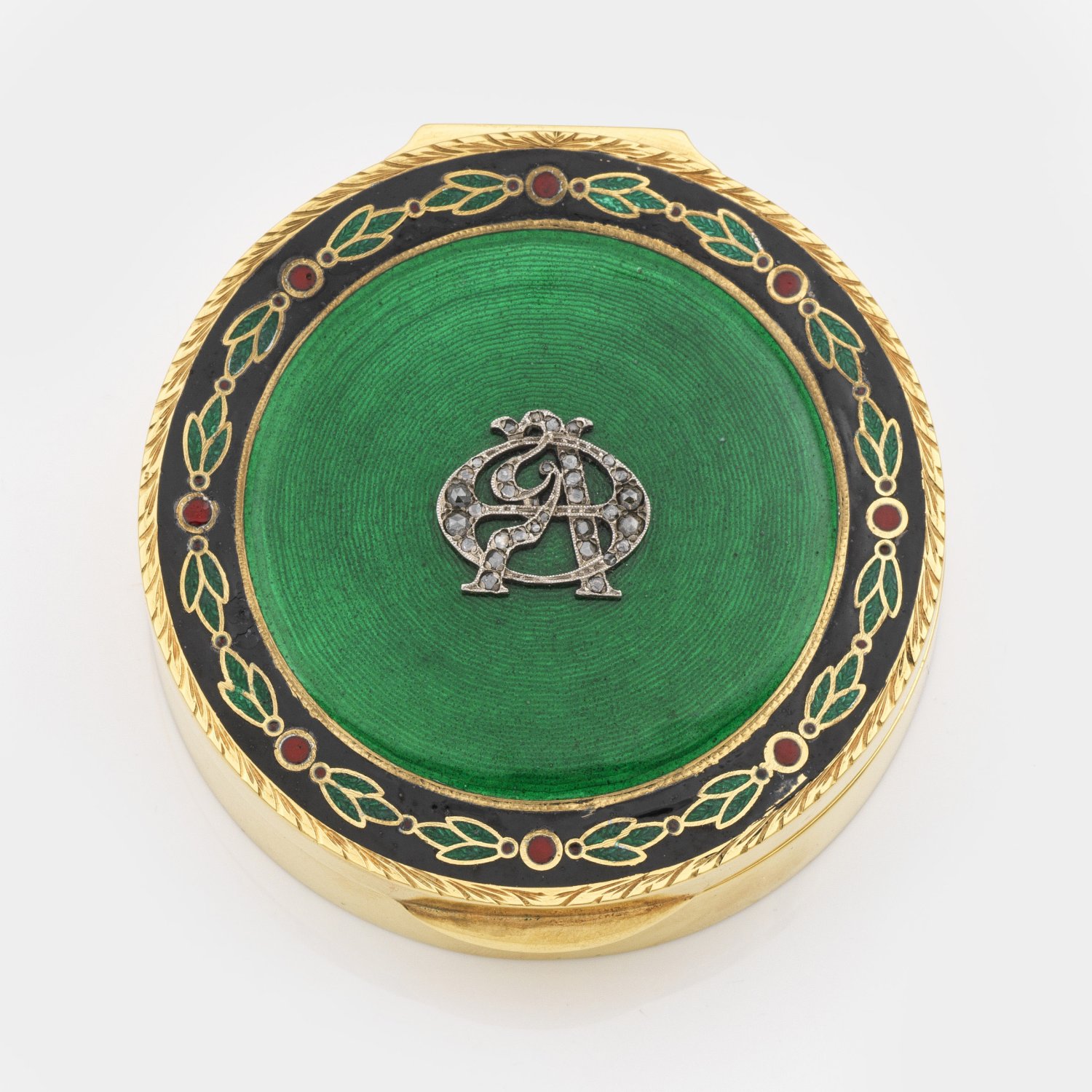 im Stil von Karl Fabergé. Silber, vergoldet, teilw. emailliert. Runde Form. Auf gering gewölbtem, scharniertem Deckel ein appliziertes, in sich verschlungenes Monogramm, mit Diamantrosen besetzt, über grasgrün emailliertem und wellenförmig guillochiertem Grund. Am Rand ein teilw. emailliertes Band mit stilisiertem Blattkranz über schwarzem Grund. Minim. Gebrauchsspuren. Gest. 88. Gew. ca. 185 g. D. 7,5 cm.