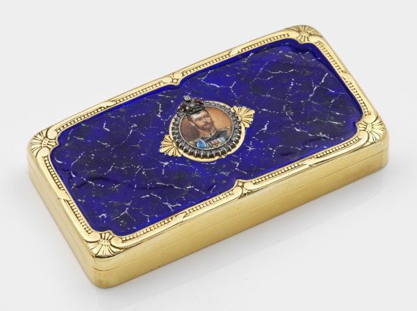 im Stil von Karl Fabergé. Mit Etui. Silber, vergoldet und teilw. emailliert. Rechteckig, mit gerundeten Ecken. Der scharnierte Deckel royalblau emailliert sowie weiß und grau meliert. Zentral eingelassenes, bekröntes Medaillon mit Porträtminiatur von Zar Nikolaus II. von Russland in polychromer Emailmalerei, umzogen von Diamantrosen. Der Rand reliefplastisch mit Ornamentband verziert. Gest. 88. Gew. ca. 310 g. H. 2 cm. 12 cm x 6,5 cm.