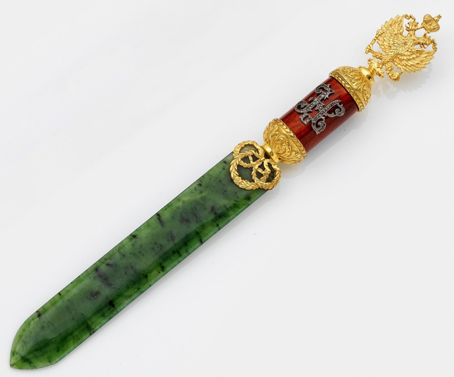 im Stil von Karl Fabergé. Nephrit mit Silbermontierung, teilw. vergoldet. Konisch geschliffene Schneide mit vergoldetem Blattfries und zylindrischem, blutrot emailliertem Griff. Schauseitig appliziertes Monogramm, besetzt mit Diamantrosen. Als Abschluss plastischer, bekrönter Doppeladler. Gest. 88. L. 26 cm.