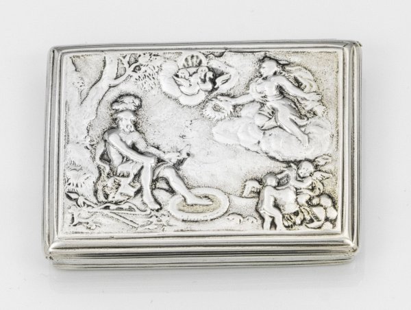 Silber, teilw. vergoldet. Flacher, rechteckiger Korpus mit mehrfach profilierten Ecken und Kanten. Auf dem scharnierten Deckel reliefplastische, mythologische Darstellung eines Kriegers, unter einem Baum sitzend. Aus dem Himmel wird ihm von einer Frauengestalt mit mehreren Putti ein Lorbeerkranz übergeben. Innen vergoldet. Altersgemäße Gebrauchsspuren, Restvergoldung. Undeutl. gest., wohl preußischer Steuerstempel "F(?)W". Gew. ca. 90 g. H. 1 cm. 7,5 cm x 5,5 cm.