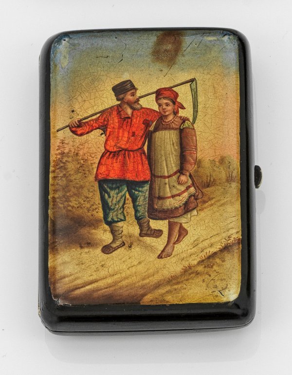 Pappmaché, schwarz lackiert. Rechteckige Form mit abgerundeten Kanten und Ecken. Auf dem scharnierten Deckel die Darstellung eines jungen Bauernpaares, eng nebeneinander laufend mit geschulterter Sichel. Irisierend, polychrome Lackmalerei. Im Inneren rot lackiert. Altersbedingte Gebrauchsspuren, teilw. best.; 9,5 cm x 6,5 cm.