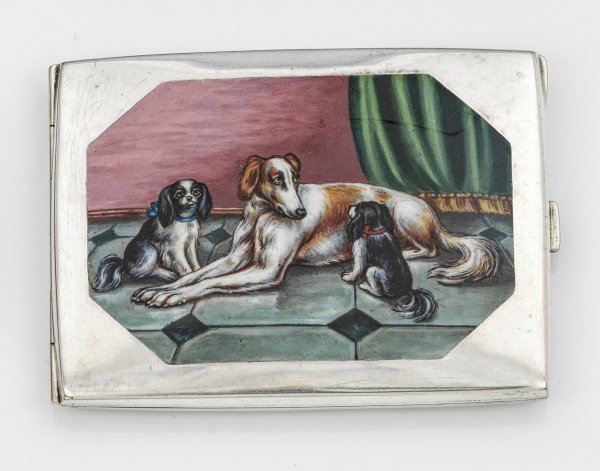 Silber, teilw. emailliert. Rechteckige, leicht aufgewölbte Form. Auf dem scharnierten Deckel achtfach gekantete Kartusche mit Darstellung von drei Hunden vor einem grünen Vorhang liegend bzw. sitzend. Polychrome Emailmalerei. Innen vergoldet. Minim. Gebrauchsspuren. 10,5 cm x 7,5 cm.