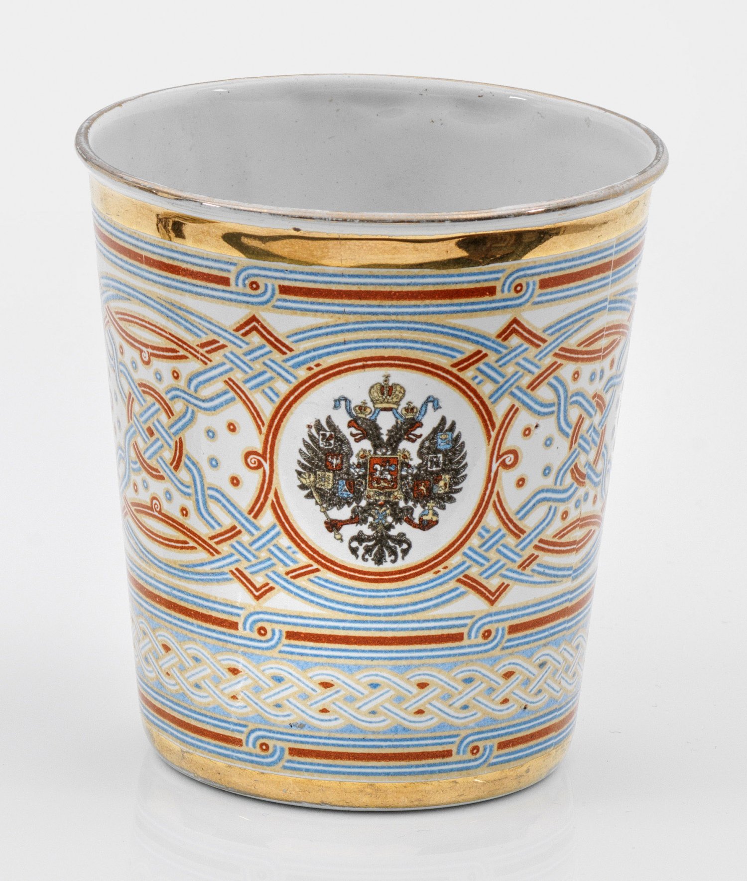 Metall, emailliert. Konischer Korpus. Flächendeckend weiß emailliert sowie blau, rot und gold staffiert. Wandung von Ornamentbändern und Bandelwerk umzogen. Schauseitige Kartusche mit bekröntem, kyrillischem Zaren-Monogramm. Darunter dat. "1896". Rückseitiger Doppelkopfadler. Polychromer Umdruck. Teilw. ber.; H. 10,5 cm. D. 9,5 cm.
