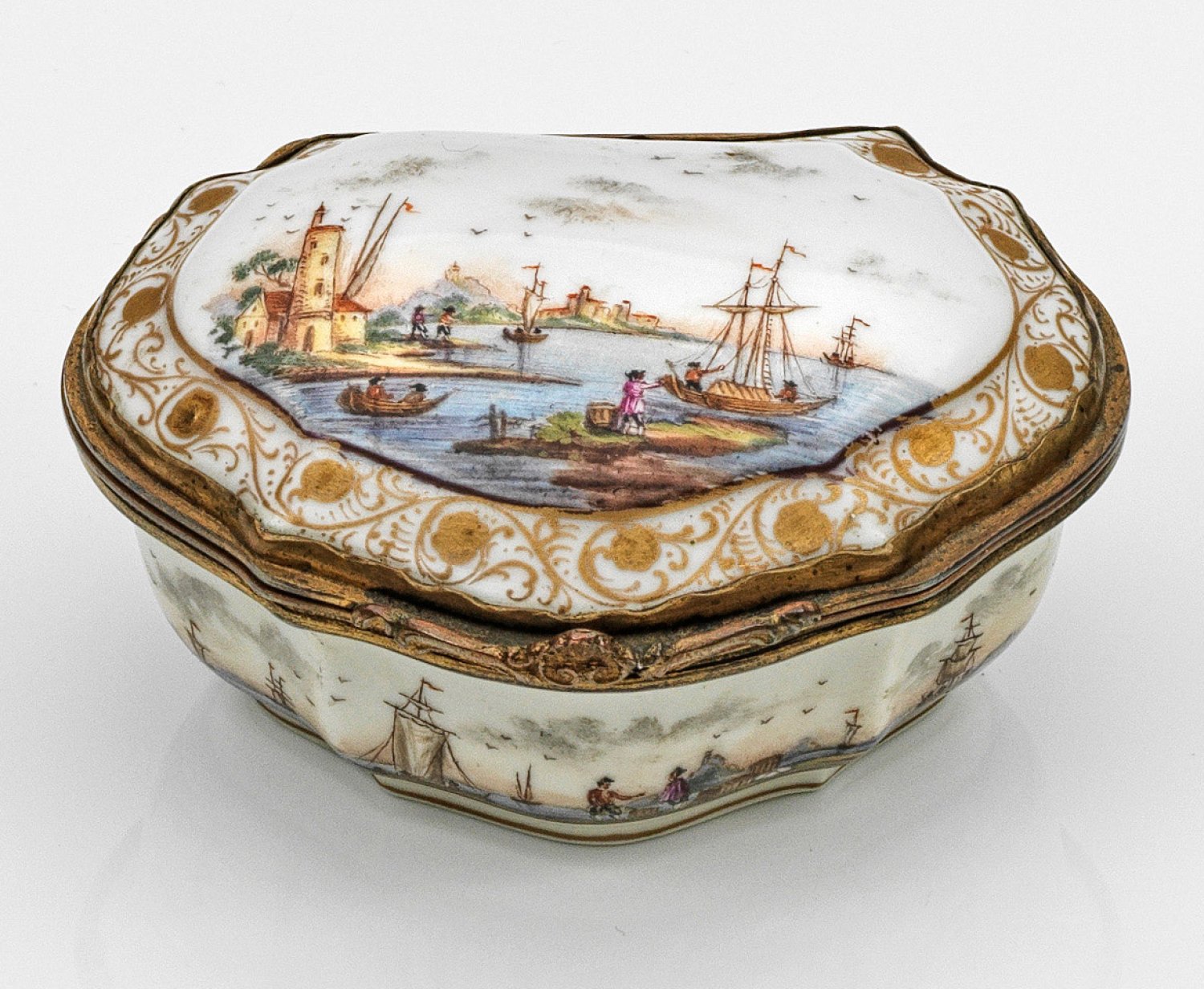 Porzellan und Kupfer, vergoldet. Passig geschweifter, bombierter Korpus. Auf der Wandung und dem Deckel detailreiche Kauffahrteiszenen mit Figurenstaffagen vor weiten Küsten- und Berglandschaften. Deckelrand umzogen von goldenen Blütenzweigen. Innenwandung verziert mit Streublumendekor. H. 4,2 cm. 8,5 x 7 cm.