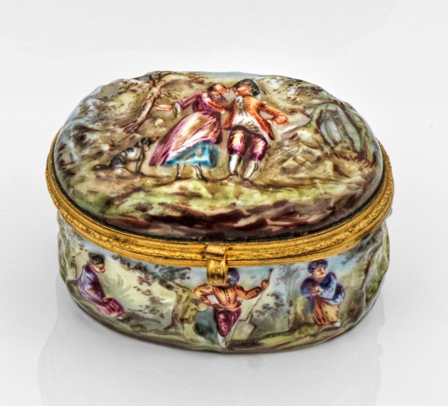 Ovale Form mit vergoldeter Messingmontierung. Auf der Wandung umlaufend Landschaften mit Figurenstaffagen, Schafen und Hunden. Auf scharniertem Deckel die Darstellung eines verliebten Paares vor bewaldeter Landschaft. Innen flächendeckend vergoldet. Polychrome Malerei. Mehrfach profilierte Montierung und geschweifte Daumenrast. Manufakturmarke. H. 3,5 cm. 6,3 cm x 5,2 cm.