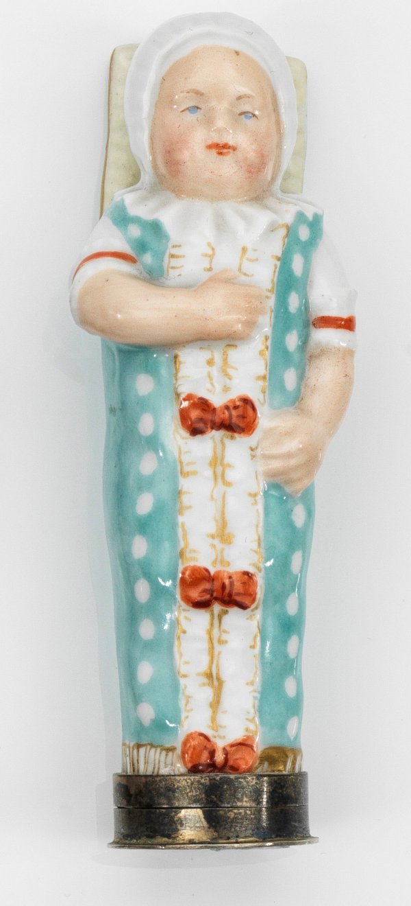 in Form eines Wickelkindes. Porzellan mit Silbermontierung, teilw. vergoldet. Polychrome Malerei mit Goldstaffage. Flacher Scharnierdeckel mit Gravur "Edvard Neergaard 19.4.13". Manufakturmarke sowie gest. 925, Herstellerzeichen. H. 8,7 cm.