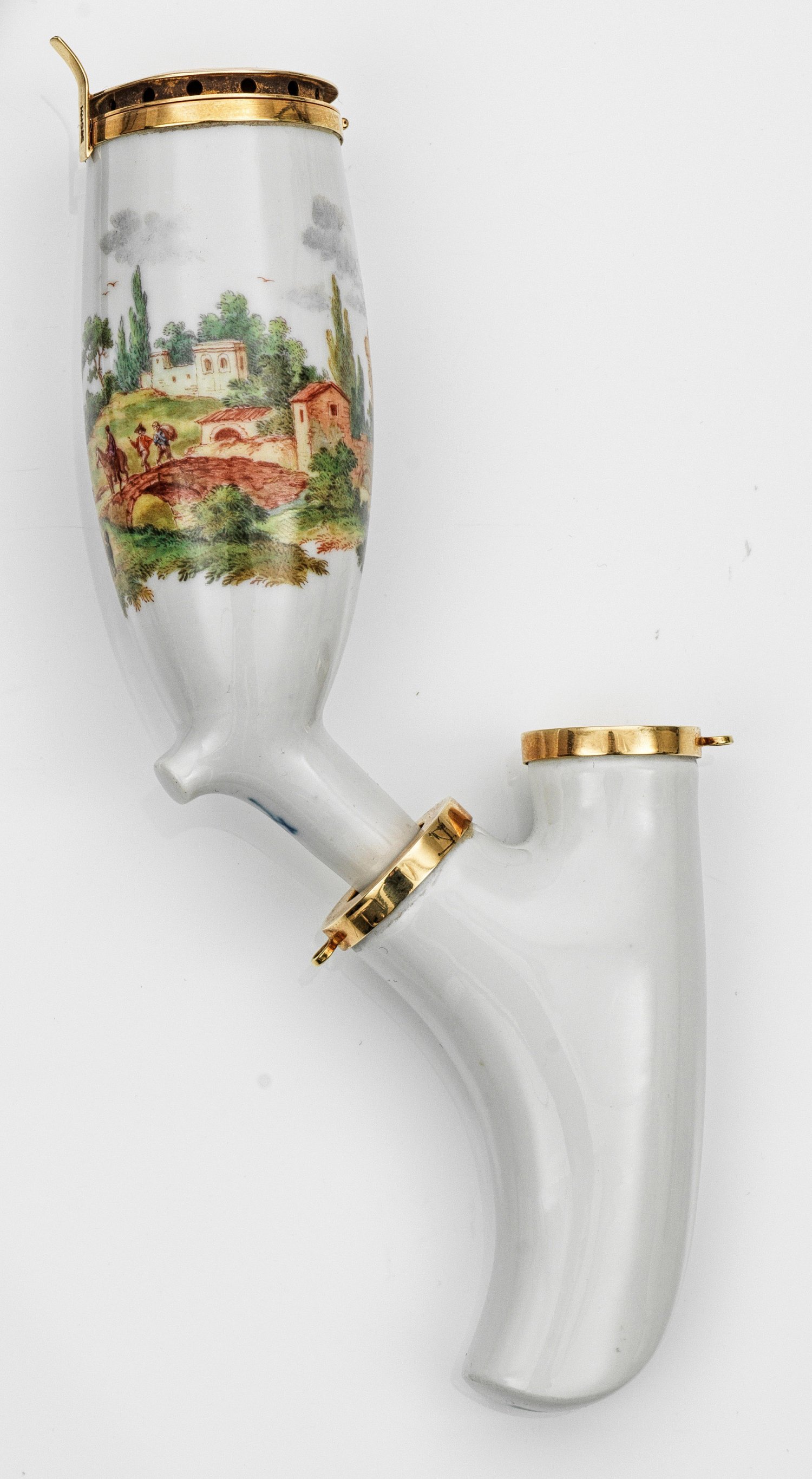 und Holm. Porzellan mit Goldmontierung. Kolbenförmiger Korpus im Stil des 19. Jhs.; Auf der Wandung umlaufende, architekturbestandene Landschaftsszene mit Figurenstaffage "en miniature" in äußerst feiner, polychromer Malerei. Scharnierdeckel gest. 585. Schwertermarke. Pfeifenkopf-L. 11 cm.