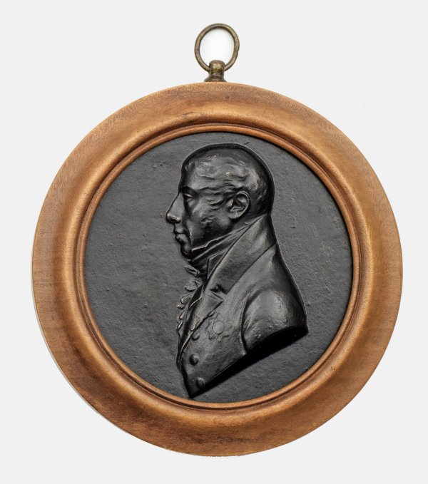Berliner Eisen, geschwärzt. Runde, hochreliefplastische Büste eines jungen Herren im Profil nach links. Unterhalb des Revers seiner Jacke angedeutet der Schwarze Adlerorden. Mit Öse und Holzrahmen. D. 7 cm.