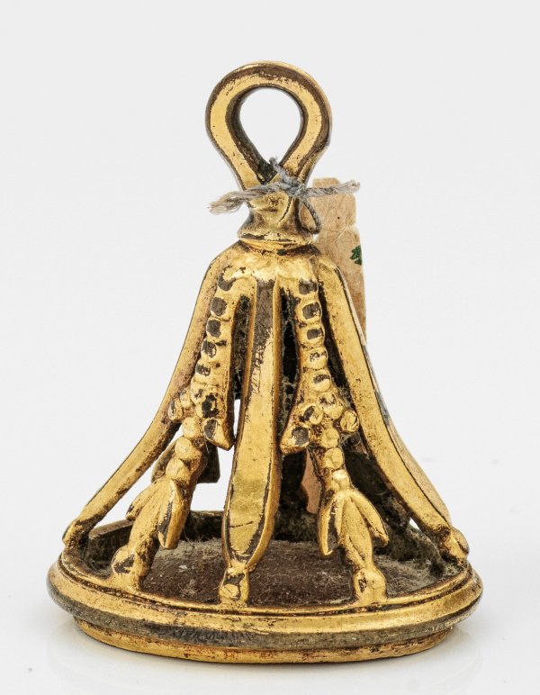 Kupfer, vergoldet. Glockenförmiger, durchbrochen gearbeiteter und mit stilisierten Blattranken verzierter Anhänger mit Öse. Ovale, zargengefasste Karneolplatte mit geschnittener Darstellung eines Singvogels, auf einem Herz sitzend. Altersgemäße Gebrauchsspuren. H. 3,5 cm.