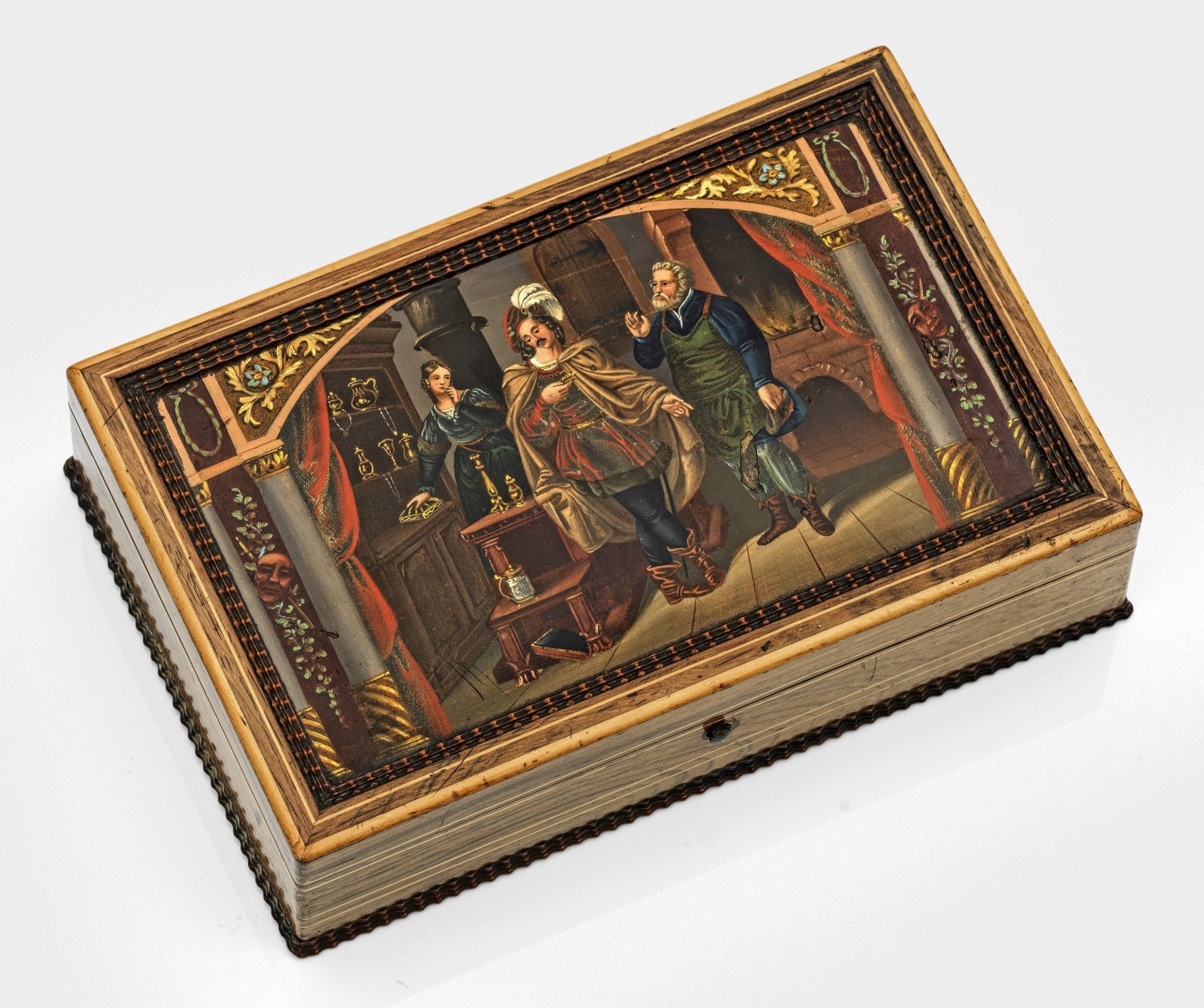 Palisander und Ahorn, furniert. Gerader, rechteckiger Korpus, am Rand von schmaler Flammleiste umzogen. Auf dem scharnierten Deckel eine ebenfalls von Flammleisten und Ahorneinlagen gerahmte Darstellung eines Edelmannes mit schwerem Umhang und Federhut im Geschäft eines Kunstschmieds. Im Hintergrund ein brennender Ofen sowie ein Regal mit Verkaufsgegenständen. Polychrome Lackmalerei. Minim. besch.; H. 4,5 cm. 18 cm x 11,5 cm.