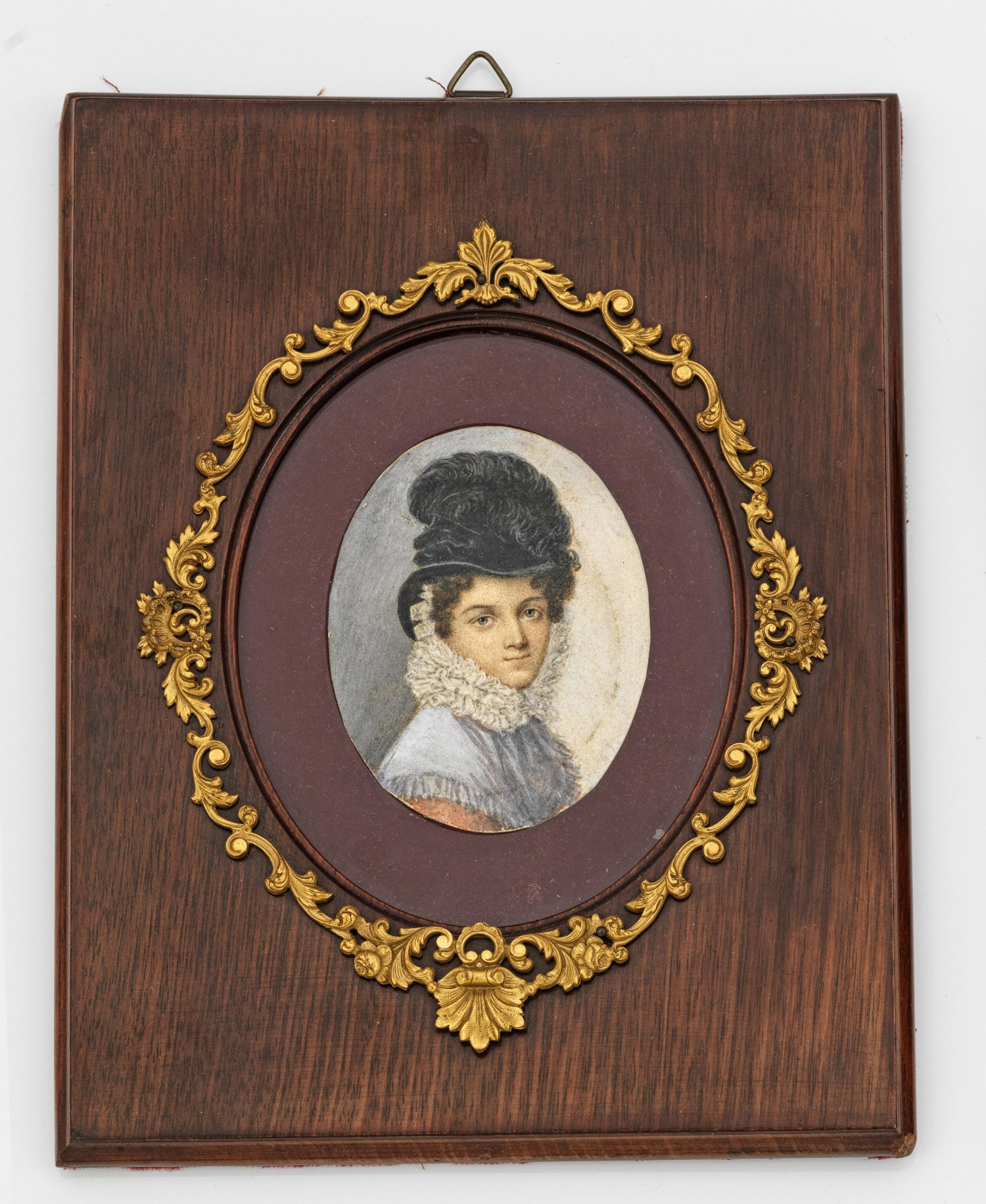 Brustbildnis einer jungen Dame mit üppigem, schwarzem Federhut und gestärktem Rüschenkragen. Über den Schultern ein hellblaues Spitzentuch. Temperamalerei. Breiter, dunkler Holzrahmen mit floral durchbrochen gearbeiteter Messingblende und weinrotem Samt. 8 cm x 6,3 cm.