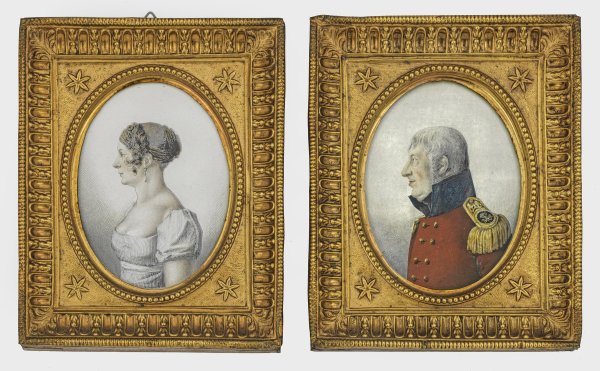 Gegenstücke. Ovale Profilporträts eines Herren in roter Uniform mit dunkelblau-schwarzem Kragen und goldenen Epauletten, bestickt mit dem Monogramm König Friedrich Wilhelm II. von Preußen sowie einer Dame mit zart gestreiftem Empire-Kleid und hochgestecktem Haar. Neutral heller Hintergrund. Auf rückseitigem Etikett dat. und bez. "F. Ravache. 1810.". Gouache auf Papier. Goldfarbene, breite, rechteckige und reliefplastisch üppig verzierte Rahmung. 10 cm x 7,5 cm.
