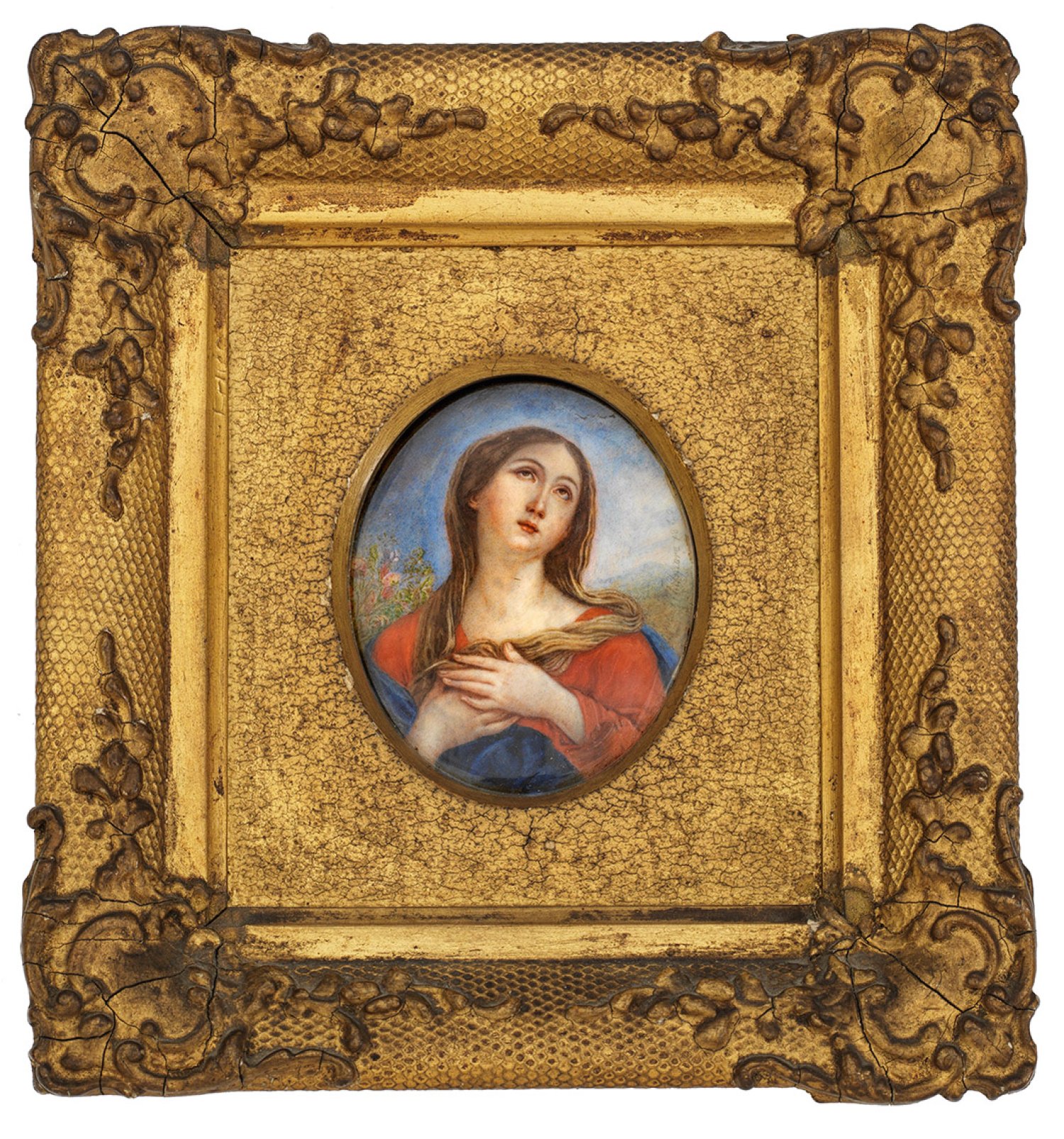 Brustbildnis einer Madonna gen Himmel blickend. Bekleidet mit einem roten Kleid und blauem Tuch über den Schultern. Im Hintergrund eine bergige Landschaft bzw. zart rankende Blüten. R. m. sign. und dat. Whitmore 1860 (?). Feine Temperamalerei. Vergoldeter, stuckierter Rahmen; 9 cm x 7,5 cm.