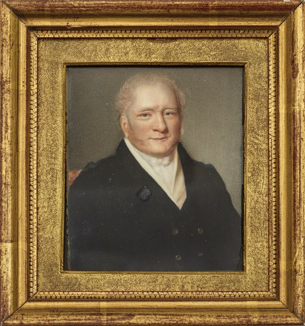 Brustbildnis eines sitzenden, älteren Herren mit weißem Haar und langen Koteletten, bekleidet mit schwarzem Gewand über weißem Hemd. Grauer Hintergrund. Temperamalerei. Wohl von Sir William Charles Ross (1794-1860). Vergoldeter Holzrahmen. Minim. besch.; 10,5 cm x 7,5 cm.