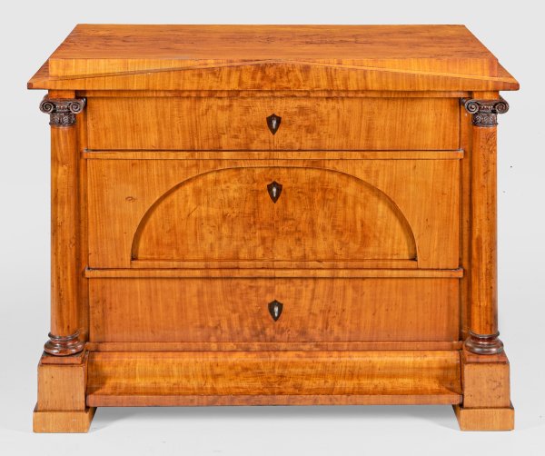 Helles Mahagoni, furniert. Gerader, querrechteckig angelegter Korpus, flankiert von eingestellten Vollsäulen mit ionischen Kapitellen auf gekanteten Füßen. In der gegliederten Front vier Schubladen unterschiedlicher Größe. Gering überstehende Deckplatte mit flachem Schinkelgiebel. H. 86 cm. 109 cm x 57 cm.