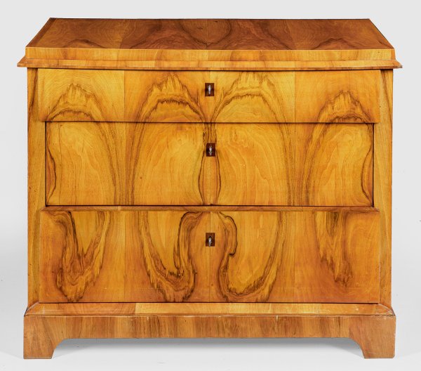 Nussbaum, furniert. Gerader, querrechteckig angelegter Korpus auf schmaler Zarge und gesägten Füßen. In der gegliederten Front drei Schubladen unterschiedlicher Größe. Gestuft ansteigende Deckplatte. Flächendeckende Furnierfelder, schauseitig im Verlauf. H. 84 cm. 101 cm x 50 cm.