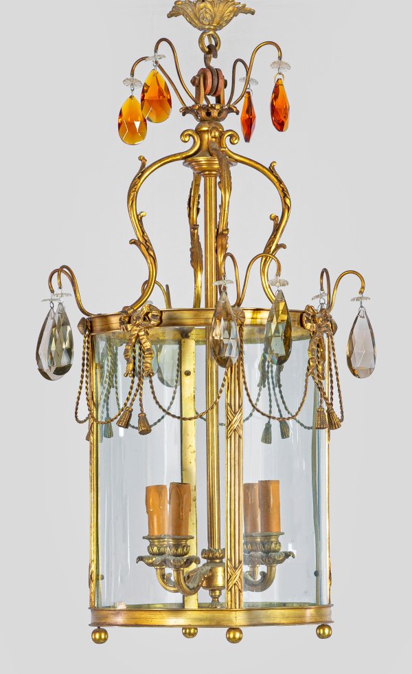 4-flg.; Messing und farbloses bzw. topasfarbenes Glas. Zylinderförmiger Korpus auf schmalen Profilstreben, umgeben von schleifenbekrönten Festons aus Kordelband. Volutenförmiger oberer Abschluss sowie Bekrönungen aus gebogten Streben. Behang aus facettierten Prismen. Innen schlanker Schaft als Träger für Leuchtmittel. Elektrifiziert. H. 77 cm. D. 37 cm.
