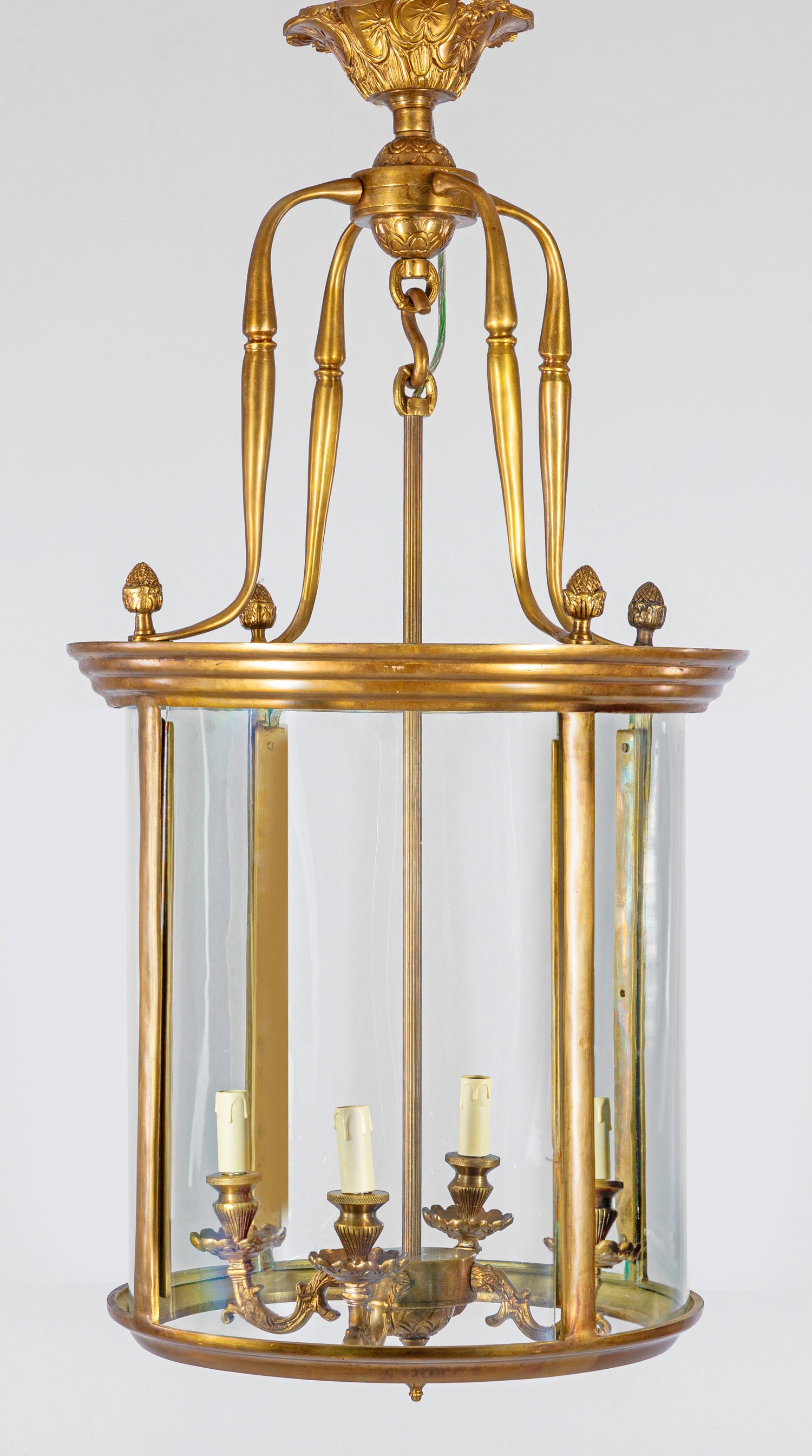 4-flg.; Bronze. Zylinderförmiger Korpus aus schmalen Streben sowie profilierten Reifen. Oberer Abschluss aus stark geschwungenen Voluten mit Zapfenbekrönungen. Innen schlanker Schaft als Träger für blattreliefierte Leuchtmittel. Elektrifiziert. H. 114 cm. D. 55 cm.
