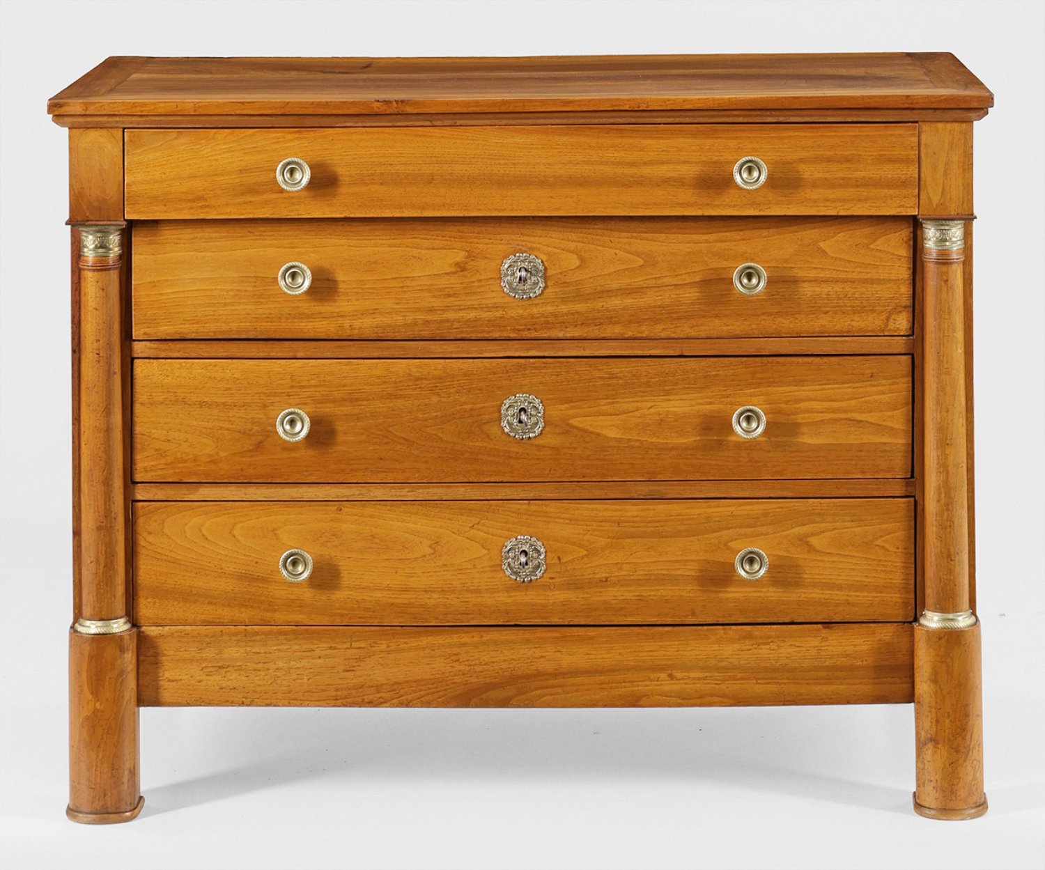 Nussbaum, furniert. Gerader, querrechteckig angelegter Korpus, flankiert von eingestellten Halbsäulen mit reliefierten Basen und Kapitell auf kräftigen Rundfüßen. In der gegliederten Front vier breite, teilw. vorkragende Schubladen unterschiedlicher Größe. Rest. mit Erg.; H. 93 cm. 123 cm x 59 cm.