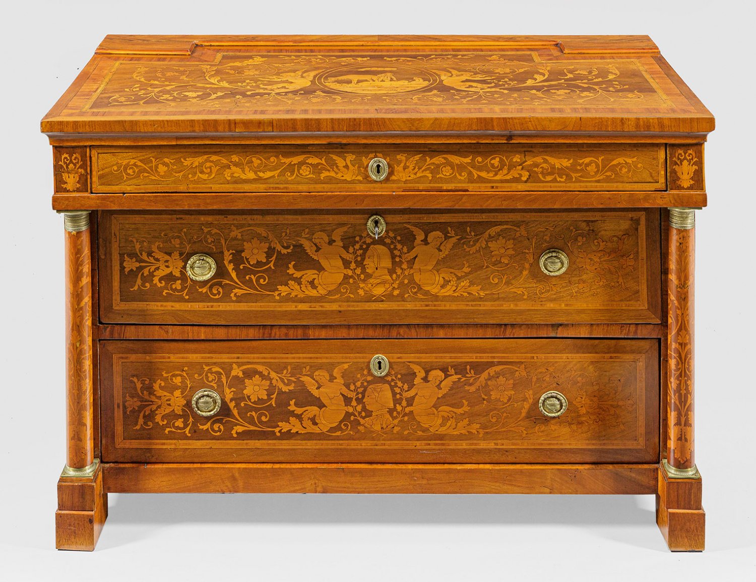 Nussbaum, furniert sowie Einlagen aus unterschiedlichen Edelhölzern. Gerader, querrechteckig angelegter Korpus, flankiert von eingestellten Säulen auf schmaler Zarge und gekanteten Füßen. In der gegliederten Front drei breite, teilw. vorkragende Schubladen unterschiedlicher Größe. Gering überstehende, rechteckige Deckplatte mit flacher Erhöhung als hinterer Abschluss. Flächendeckend breit gerahmte Furnierfelder mit unterschiedlichen Landschaftstondi, intarsierten Genien und üppigen Blattvoluten, von Bandeinlagen begrenzt. H. 82 cm. 124 cm x 63 cm.