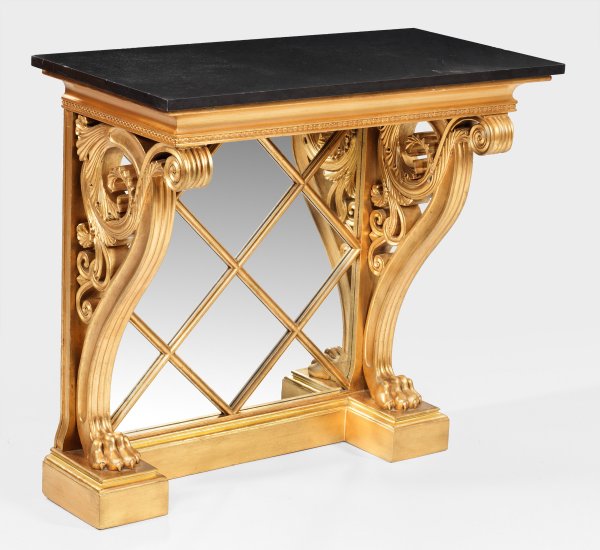 Holz, geschnitzt, gefasst und vergoldet. Über schmalem Profilsockel durchbrochen gearbeitete Seitenwangen aus üppigen Volutenmotiven sowie verspiegelte Rückwand mit Gitterdekor als Träger für profilierte, gekehlte Zarge sowie rechteckige Deckplatte aus anthrazitfarbenem Marmor. Rest.; H. 86 cm. 90 cm x 45 cm.