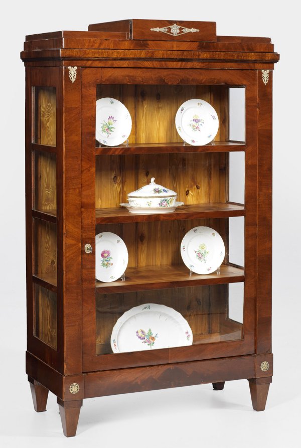 Mahagoni, furniert. Gerader, hochrechteckiger, dreiseitig sprossenverglaster Korpus auf konischen Vierkantbeinen. In der gegliederten Front große Vitrinentür. Gestuft ansteigendes Gesims sowie einschübiger, podestförmiger oberer Abschluss. Rest. mit Erg.; 171 cm. 103 cm x 49 cm.