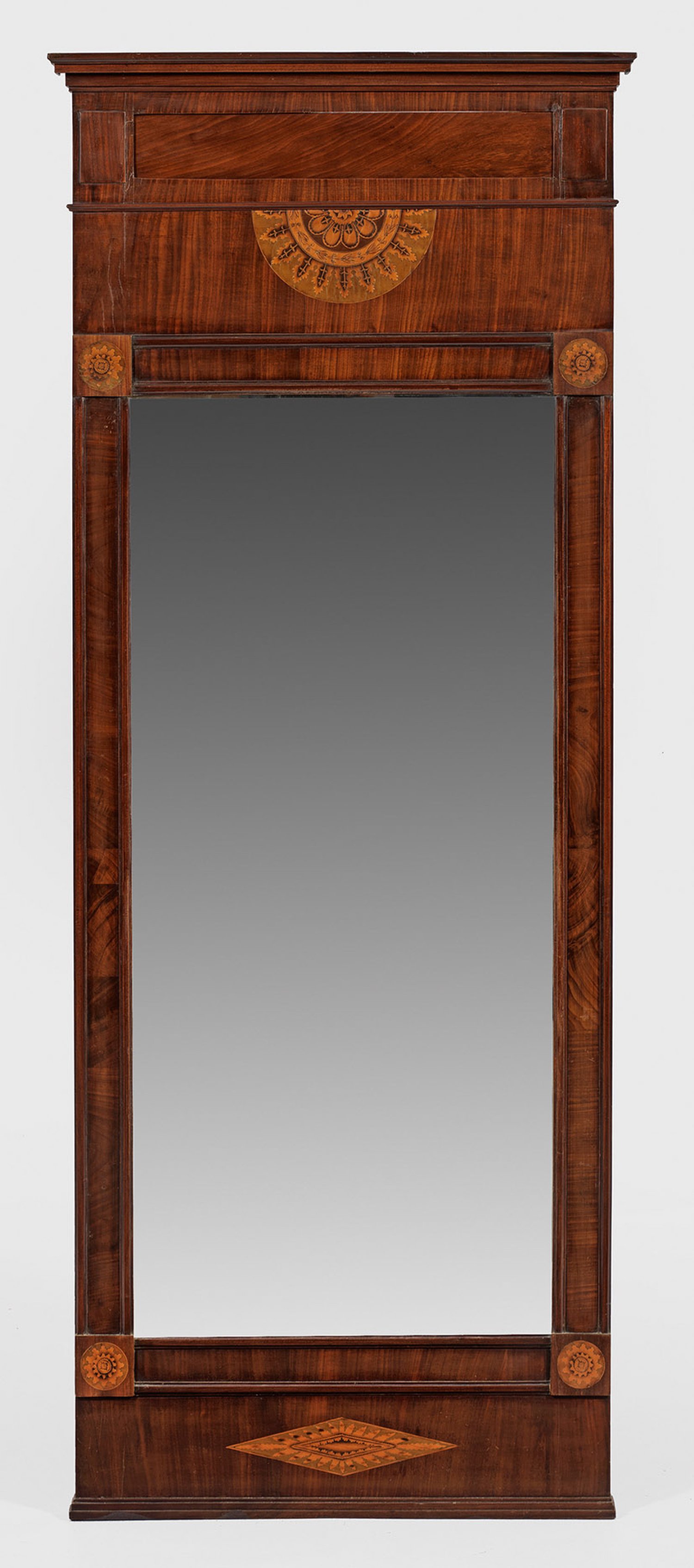 Mahagoni, furniert sowie Einlagen aus teilw. grün gefärbten Hölzern wie Ahorn. Gerade, hochrechteckige, schmal profilierte Spiegelrahmung mit verkröpften Ecken und intarsierten Blütenrosetten. Breites Giebelfeld mit korrespondierender Intarsie sowie schmalem Gesims. Entsprechender unterer Abschluss. Facettiertes Spiegelglas. Unbez.; 197 cm x 79 cm.