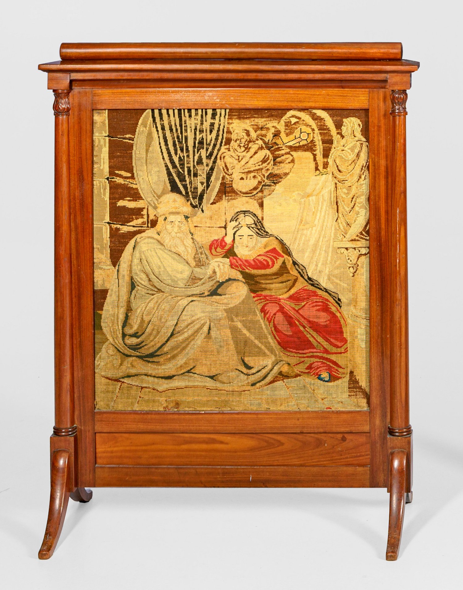 Mahagoni. Rechteckige Rahmung, flankiert von blattreliefierten Schäften auf ausgestellten Beinen. Im Innenfeld flächendeckende Petit Point Stickerei mit biblischer Szene. H. 104 cm. 80,5 cm x 33,5 cm.