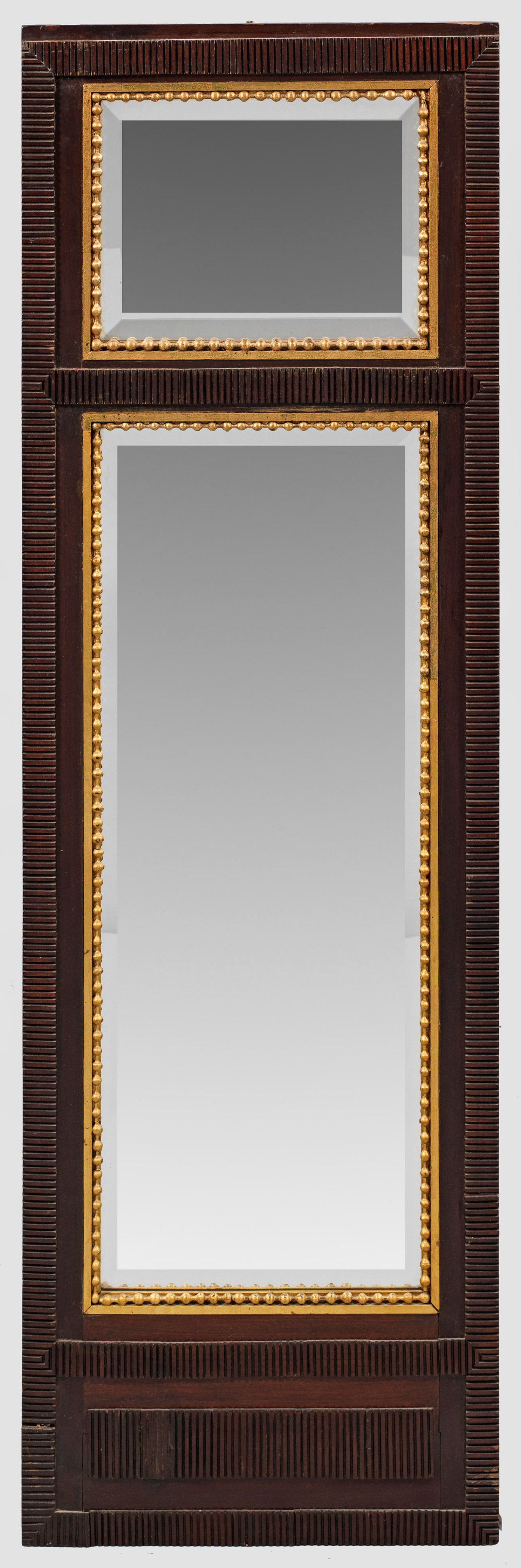 Mahagoni, furniert sowie Holz, gefasst und vergoldet. Gerade, hochrechteckige Spiegelrahmung mit Rippen- bzw. Perlstabfries. Facettiertes Spiegelglas. 130 cm x 41,5 cm.