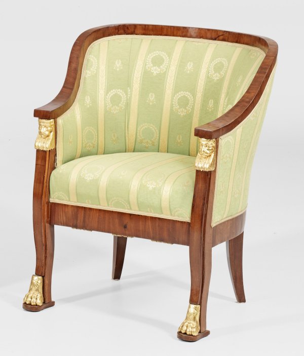 Mahagoni, furniert sowie teilw. geschnitzt, gefasst und vergoldet. Hufeisenförmige Zarge auf leicht geschwungenen Beinen mit reliefplastischen Tatzenfüßen, in entsprechende Strebe mit Löwenkaryatide übergehend. Geschweift ansteigende Armlehnen sowie stark gewölbte Rückenlehnenrahmung. Allseitig gepolstert und bezogen. H. 87 cm. 69 cm x 55 cm. Sitz-H. 47 cm.
