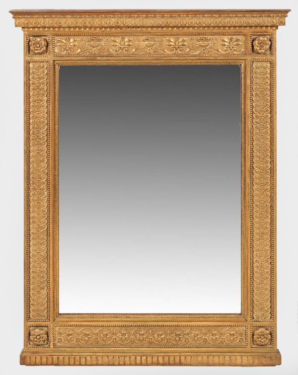 Holz, stuckiert, gefasst und vergoldet. Hochrechteckige Spiegelrahmung aus breiten, unterschiedlichen Friesen und Perlstab mit plastischen Blütenrosetten in den Ecken. Oberhalb schmales Profilgesims. Rückseitig ausklappbarer Aufsteller. 99 cm x 77 cm.