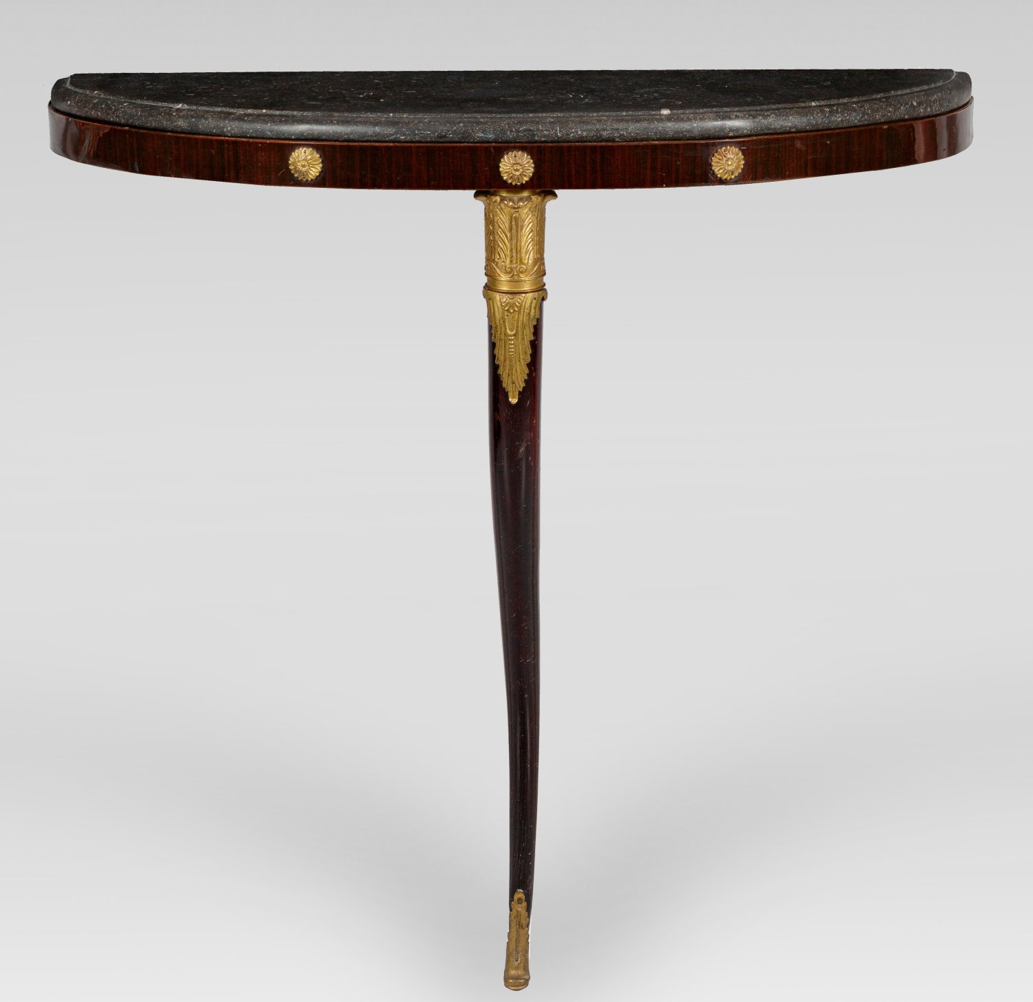 Mahagoni, massiv und furniert sowie Bronze. Flache, bombierte Zarge auf hoher, spitz zulaufender Volute mit reliefiertem Blattwerk. Gering überstehende, profilierte Deckplatte aus anthrazitfarbenem Marmor. H. 87 cm. 82 cm x 26,5 cm.