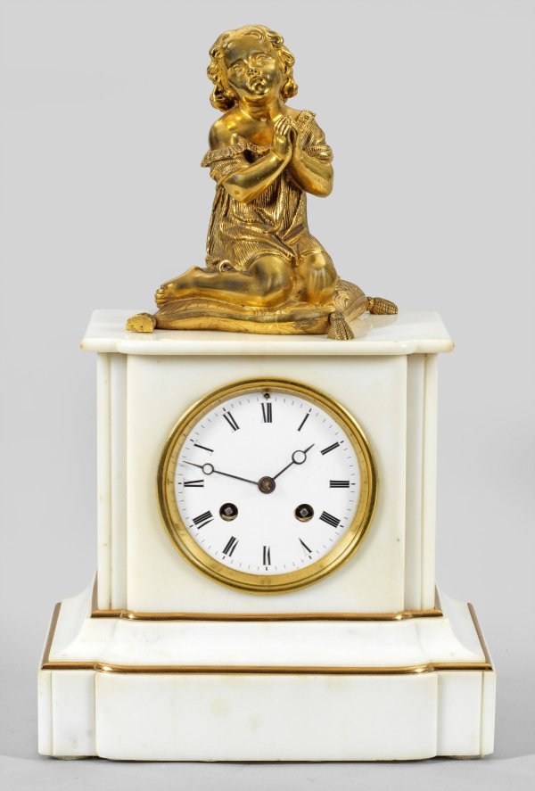 Weißer Mamor und Bronze, vergoldet. Über gekehltem Profilsockel rechteckiges Uhrengehäuse mit profilgerahmtem Emailzifferblatt. Figurale Bekrönung in Gestalt eines betenden Kindes. Pendulenwerk mit Pendelfeder sowie Schlagwerk auf Glocke. H. 36 cm.
